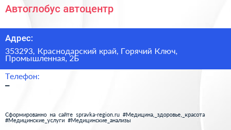 Автоглобус, автоцентр по адресу 353293, Краснодарский край, Горячий Ключ, Промышленная, 2Б в дальнейшем Организация, размещена в следующих категориях:
