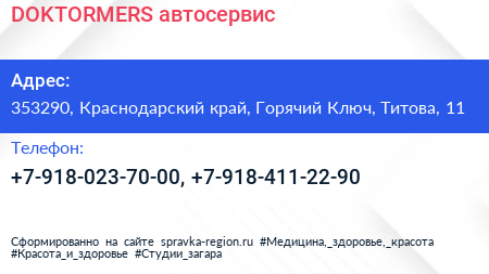 DOKTORMERS, автосервис по адресу 353290, Краснодарский край, Горячий Ключ, Титова, 11 в дальнейшем Организация, размещена в следующих категориях: