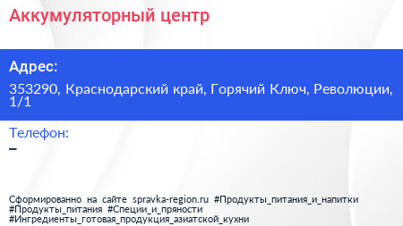 Аккумуляторный центр по адресу 353290, Краснодарский край, Горячий Ключ, Революции, 1/1 в дальнейшем Организация, размещена в следующих категориях: