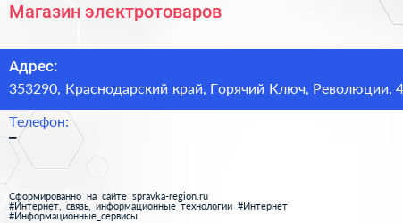 Магазин электротоваров по адресу 353290, Краснодарский край, Горячий Ключ, Революции, 4 в дальнейшем Организация, размещена в следующих категориях: