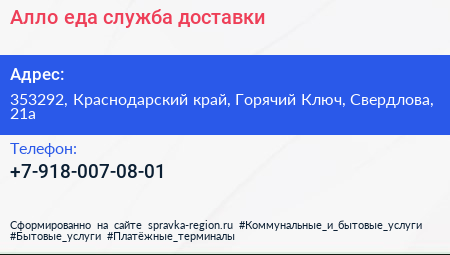 Алло.еда, служба доставки по адресу 353292, Краснодарский край, Горячий Ключ, Свердлова, 21а в дальнейшем Организация, размещена в следующих категориях: