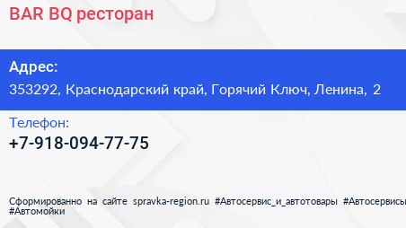 BAR-BQ, ресторан по адресу 353292, Краснодарский край, Горячий Ключ, Ленина, 2 в дальнейшем Организация, размещена в следующих категориях: