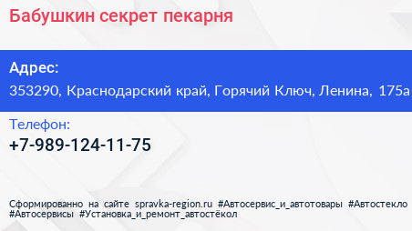 Бабушкин секрет, пекарня по адресу 353290, Краснодарский край, Горячий Ключ, Ленина, 175а в дальнейшем Организация, размещена в следующих категориях:
