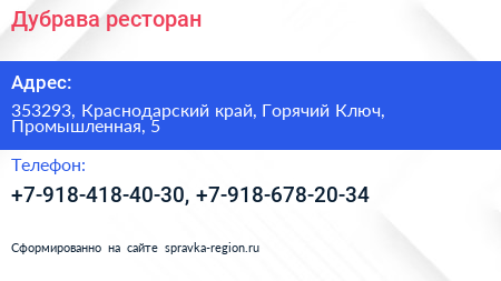 Дубрава, ресторан по адресу 353293, Краснодарский край, Горячий Ключ, Промышленная, 5 в дальнейшем Организация, размещена в следующих категориях: