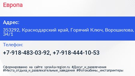 Европа по адресу 353292, Краснодарский край, Горячий Ключ, Ворошилова, 34/1 в дальнейшем Организация, размещена в следующих категориях: