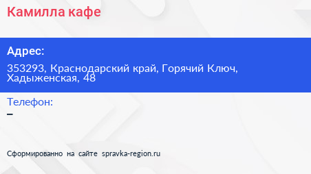 Камилла, кафе по адресу 353293, Краснодарский край, Горячий Ключ, Хадыженская, 48 в дальнейшем Организация, размещена в следующих категориях: