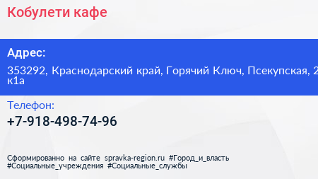Кобулети, кафе по адресу 353292, Краснодарский край, Горячий Ключ, Псекупская, 2 к1а в дальнейшем Организация, размещена в следующих категориях: