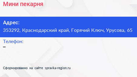 Мини-пекарня по адресу 353292, Краснодарский край, Горячий Ключ, Урусова, 65 в дальнейшем Организация, размещена в следующих категориях: