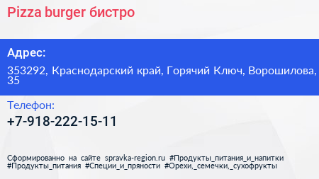 Pizza & burger, бистро по адресу 353292, Краснодарский край, Горячий Ключ, Ворошилова, 35 в дальнейшем Организация, размещена в следующих категориях: