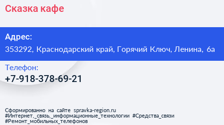 Сказка, кафе по адресу 353292, Краснодарский край, Горячий Ключ, Ленина, 6а в дальнейшем Организация, размещена в следующих категориях: