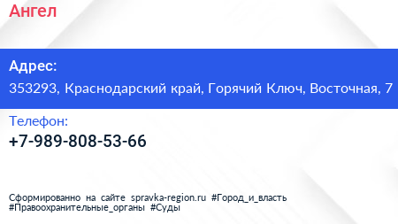 Ангел по адресу 353293, Краснодарский край, Горячий Ключ, Восточная, 7 в дальнейшем Организация, размещена в следующих категориях: