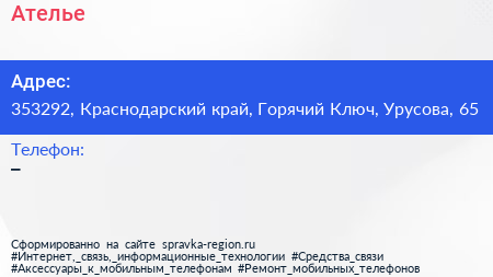 Ателье по адресу 353292, Краснодарский край, Горячий Ключ, Урусова, 65 в дальнейшем Организация, размещена в следующих категориях: