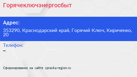 Горячеключэнергосбыт по адресу 353290, Краснодарский край, Горячий Ключ, Кириченко, 20 в дальнейшем Организация, размещена в следующих категориях: