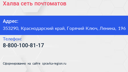 Халва, сеть почтоматов по адресу 353290, Краснодарский край, Горячий Ключ, Ленина, 196 в дальнейшем Организация, размещена в следующих категориях: