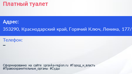 Платный туалет по адресу 353290, Краснодарский край, Горячий Ключ, Ленина, 177/а в дальнейшем Организация, размещена в следующих категориях: