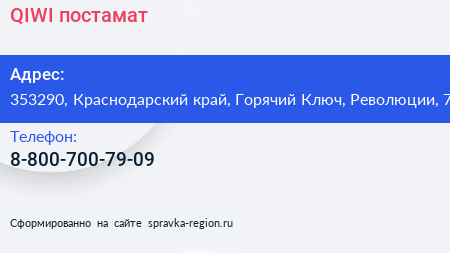 QIWI, постамат по адресу 353290, Краснодарский край, Горячий Ключ, Революции, 7 в дальнейшем Организация, размещена в следующих категориях: