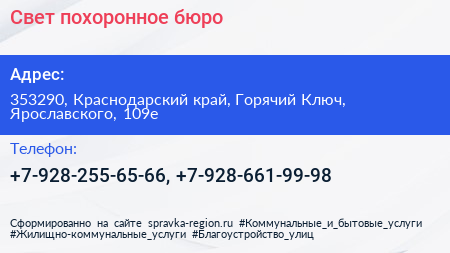 Свет, похоронное бюро по адресу 353290, Краснодарский край, Горячий Ключ, Ярославского, 109е в дальнейшем Организация, размещена в следующих категориях:
