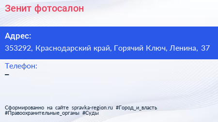 Зенит, фотосалон по адресу 353292, Краснодарский край, Горячий Ключ, Ленина, 37 в дальнейшем Организация, размещена в следующих категориях:
