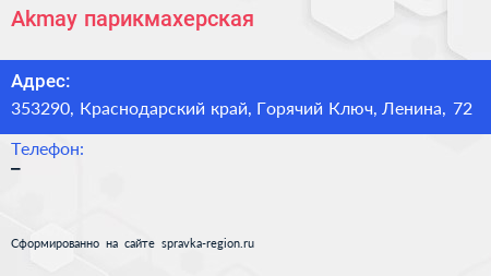 Akmay, парикмахерская по адресу 353290, Краснодарский край, Горячий Ключ, Ленина, 72 в дальнейшем Организация, размещена в следующих категориях: