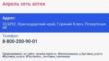 Апрель, сеть аптек по адресу 353292, Краснодарский край, Горячий Ключ, Псекупская, 68 в дальнейшем Организация, размещена в следующих категориях: