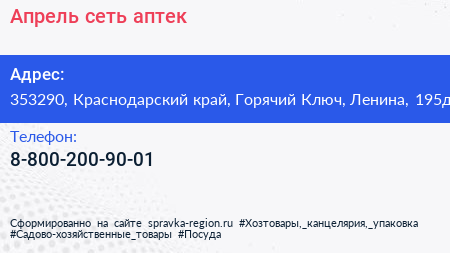 Апрель, сеть аптек по адресу 353290, Краснодарский край, Горячий Ключ, Ленина, 195д в дальнейшем Организация, размещена в следующих категориях: