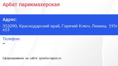 Арбат, парикмахерская по адресу 353290, Краснодарский край, Горячий Ключ, Ленина, 195г к13 в дальнейшем Организация, размещена в следующих категориях: