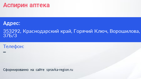 Аспирин, аптека по адресу 353292, Краснодарский край, Горячий Ключ, Ворошилова, 37Б/3 в дальнейшем Организация, размещена в следующих категориях: