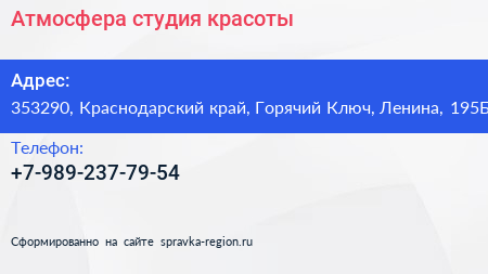 Атмосфера, студия красоты по адресу 353290, Краснодарский край, Горячий Ключ, Ленина, 195Б в дальнейшем Организация, размещена в следующих категориях: