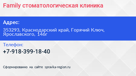 Family, стоматологическая клиника по адресу 353293, Краснодарский край, Горячий Ключ, Ярославского, 146г в дальнейшем Организация, размещена в следующих категориях: