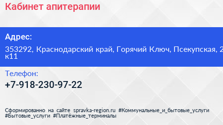 Кабинет апитерапии по адресу 353292, Краснодарский край, Горячий Ключ, Псекупская, 2 к11 в дальнейшем Организация, размещена в следующих категориях: