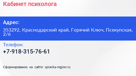 Кабинет психолога по адресу 353292, Краснодарский край, Горячий Ключ, Псекупская, 2/6 в дальнейшем Организация, размещена в следующих категориях: