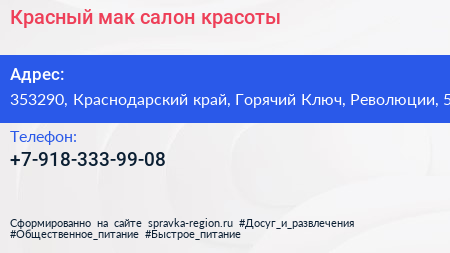 Красный мак, салон красоты по адресу 353290, Краснодарский край, Горячий Ключ, Революции, 5 в дальнейшем Организация, размещена в следующих категориях: