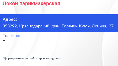 Локон, парикмахерская по адресу 353292, Краснодарский край, Горячий Ключ, Ленина, 37 в дальнейшем Организация, размещена в следующих категориях: