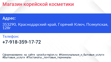 Магазин корейской косметики по адресу 353290, Краснодарский край, Горячий Ключ, Псекупская, 128г в дальнейшем Организация, размещена в следующих категориях: