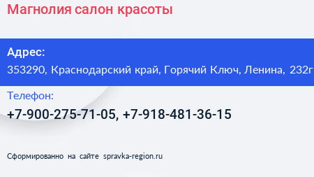 Магнолия, салон красоты по адресу 353290, Краснодарский край, Горячий Ключ, Ленина, 232г в дальнейшем Организация, размещена в следующих категориях: