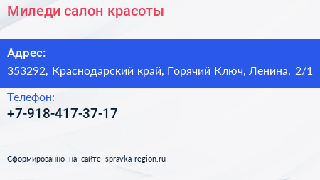 Миледи, салон красоты по адресу 353292, Краснодарский край, Горячий Ключ, Ленина, 2/1 в дальнейшем Организация, размещена в следующих категориях: