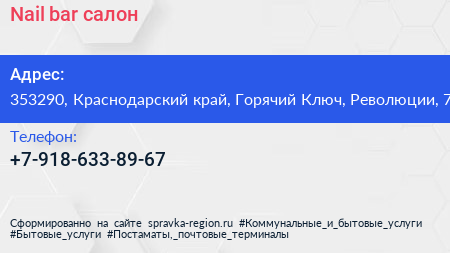 Nail bar, салон по адресу 353290, Краснодарский край, Горячий Ключ, Революции, 7 в дальнейшем Организация, размещена в следующих категориях:
