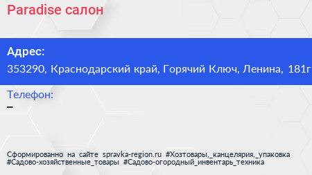 Paradise, салон по адресу 353290, Краснодарский край, Горячий Ключ, Ленина, 181г в дальнейшем Организация, размещена в следующих категориях: