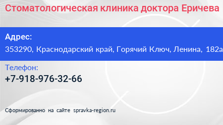 Стоматологическая клиника доктора Еричева по адресу 353290, Краснодарский край, Горячий Ключ, Ленина, 182а в дальнейшем Организация, размещена в следующих категориях: