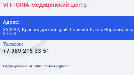 VITTORIA, медицинский центр по адресу 353292, Краснодарский край, Горячий Ключ, Ворошилова, 37Б/4 в дальнейшем Организация, размещена в следующих категориях: