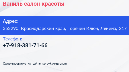 Ваниль, салон красоты по адресу 353290, Краснодарский край, Горячий Ключ, Ленина, 217 в дальнейшем Организация, размещена в следующих категориях: