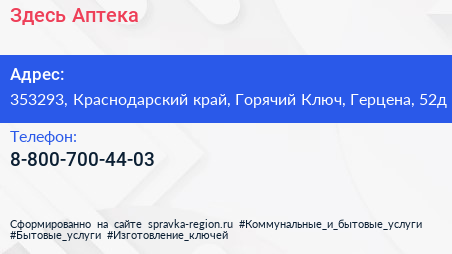 Здесь Аптека по адресу 353293, Краснодарский край, Горячий Ключ, Герцена, 52д в дальнейшем Организация, размещена в следующих категориях: