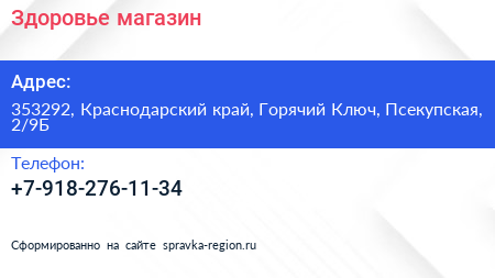 Здоровье, магазин по адресу 353292, Краснодарский край, Горячий Ключ, Псекупская, 2/9Б в дальнейшем Организация, размещена в следующих категориях: