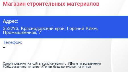 Магазин строительных материалов по адресу 353293, Краснодарский край, Горячий Ключ, Промышленная, 7 в дальнейшем Организация, размещена в следующих категориях: