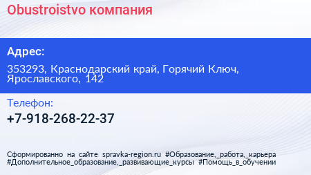 Obustroistvo, компания по адресу 353293, Краснодарский край, Горячий Ключ, Ярославского, 142 в дальнейшем Организация, размещена в следующих категориях: