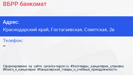 ВБРР, банкомат по адресу Краснодарский край, Гостагаевская, Советская, 2в в дальнейшем Организация, размещена в следующих категориях: