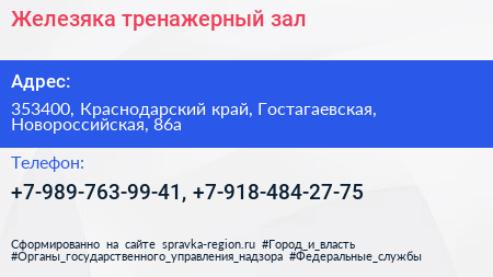 Железяка, тренажерный зал по адресу 353400, Краснодарский край, Гостагаевская, Новороссийская, 86а в дальнейшем Организация, размещена в следующих категориях: