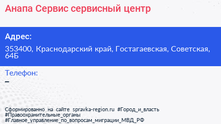 Анапа-Сервис, сервисный центр по адресу 353400, Краснодарский край, Гостагаевская, Советская, 64Б в дальнейшем Организация, размещена в следующих категориях: