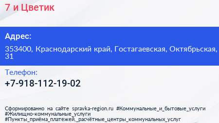 7 и Цветик по адресу 353400, Краснодарский край, Гостагаевская, Октябрьская, 31 в дальнейшем Организация, размещена в следующих категориях: