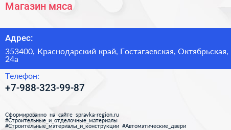 Магазин мяса по адресу 353400, Краснодарский край, Гостагаевская, Октябрьская, 24а в дальнейшем Организация, размещена в следующих категориях: